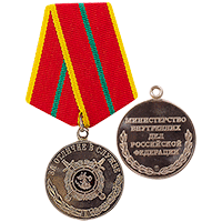 Медаль «За отличие в службе» или «Песок» I степени — одна из самых известных ведомственных медалей. Эта разновидность наградных медалей МВД выпускается на пятиугольной колодке. Алая муаровая лента медали окантована желтой полосой. В центре продольная светло-зеленая полоса, обозначающая степень: «I». Круглая 32-миллиметровая медаль изготавливается из нейзильбера методом холодной штамповки с эмалированным элементом. Надпись на медали: «За отличие в службе». На аверсе помещен круглый геральдический щит эмблемы МВД, обрамленный лавровым венком — символом славы. За щитом два перекрещенных меча остриями вниз. В красном поле щита медали «За отличие в службе» фигура воина, поражающего копьем дракона. В нижней части лаврово-дубовый венок с трапециевидной плашкой и цифрой «I».Другая наградная продукция